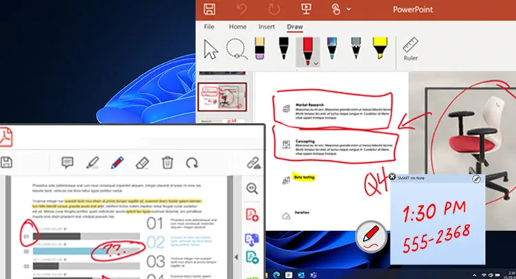 SMART Ink® software helps to keep ideas flowing and meetings dynamic. Simply pick up a pen and write into PDFs, Microsoft Office files, browsers, and connected video sources.