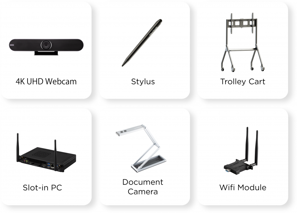 The ViewBoard® 50-5F Series has a full line-up of accessories. Customise your device with a portable speakerphone, slot-in PC, a motorised trolley cart, and a document camera, alongside many more add-ons for all teaching needs and scenarios.